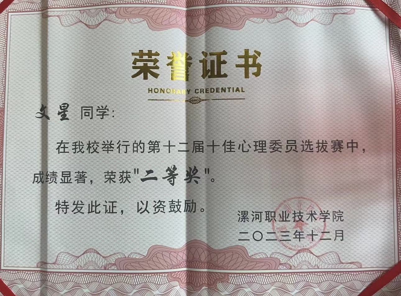 11月11日,为进一步加强我校心理健康教育工作中班级心理委员建设,发挥心理委员在心理健康教育方面的作用,表彰先进,树立典型,促进和谐校园构建。由校学工部、学生处主办的第十二届十佳心理委员选拔赛决赛在校大礼堂成功举行。此次活动,历时一个月,经过了初赛、复赛、决赛。其中,旅游与酒店管理系学子文星在“心情绽放之我型我秀才艺展示”决赛中表现突出,荣获二等奖。
