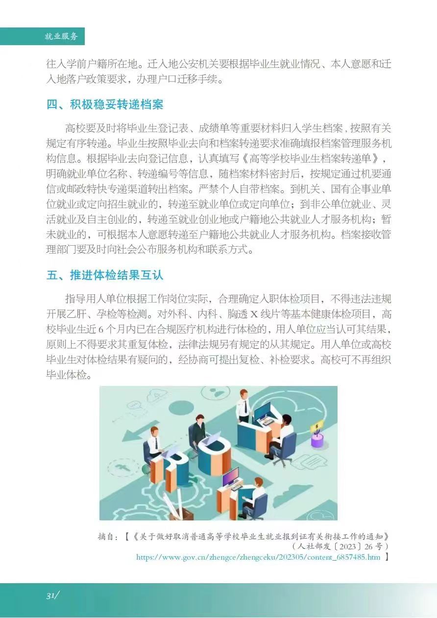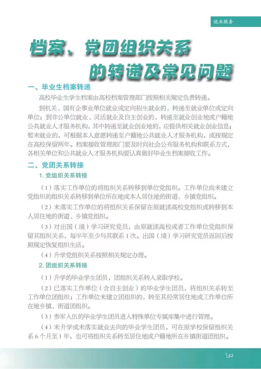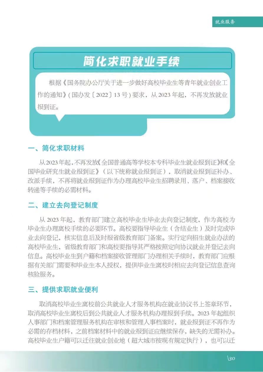 《服务指南》涵盖政策摘要、就业指导、政策性岗位介绍、就业服务等内容,其中政策摘包含灵活就业、自主创业、应征入伍等;就业指导包含升学、考公考编、就业准备、权益维护等;政策性岗位介绍包含三支一扶、选调生、特岗教师、科研助理岗等;就业服务包含毕业生签约流程、就业手续办理、档案及党团组织关系转递、就业信息获取渠道及就业主管部门通讯录等。