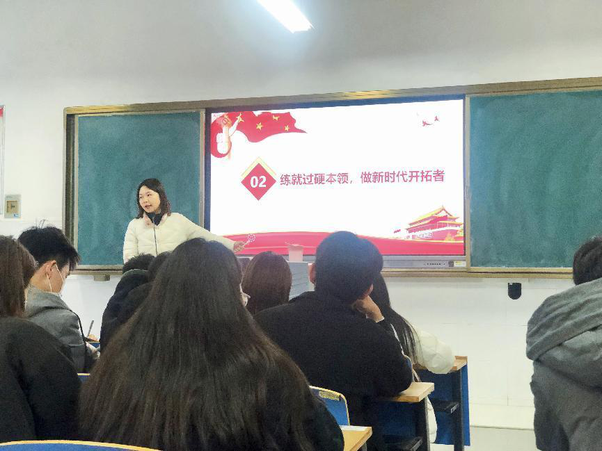 吴筱艾老师首先向同学们讲述了新青年要奋斗的重要性,让同学们懂得新时代的中国青年生在中华民族发展的最好时期,拥有更优越的发展环境、更广阔的成长空间,民族复兴的重任也将在一代代青年的接力中成为现实。勉励同学们要掌握专业技能,做新时代奋进者;练就过硬本领,做新时代开拓者;拒绝“躺平”,做新时代实干者。