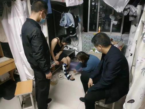 (院领导和老师们前往王云青宿舍,查看其脚部恢复情况)