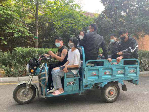 近期每一天的核酸检测给脚部受伤的王云青带来了不小的麻烦,下楼到操场的核酸检测点有很长一段距离,院领导在得知此情况后,现场协调工作人员,借来了推车和三轮车,推着学生完成了核酸采集,并且安排三轮车送学生到宿舍。
