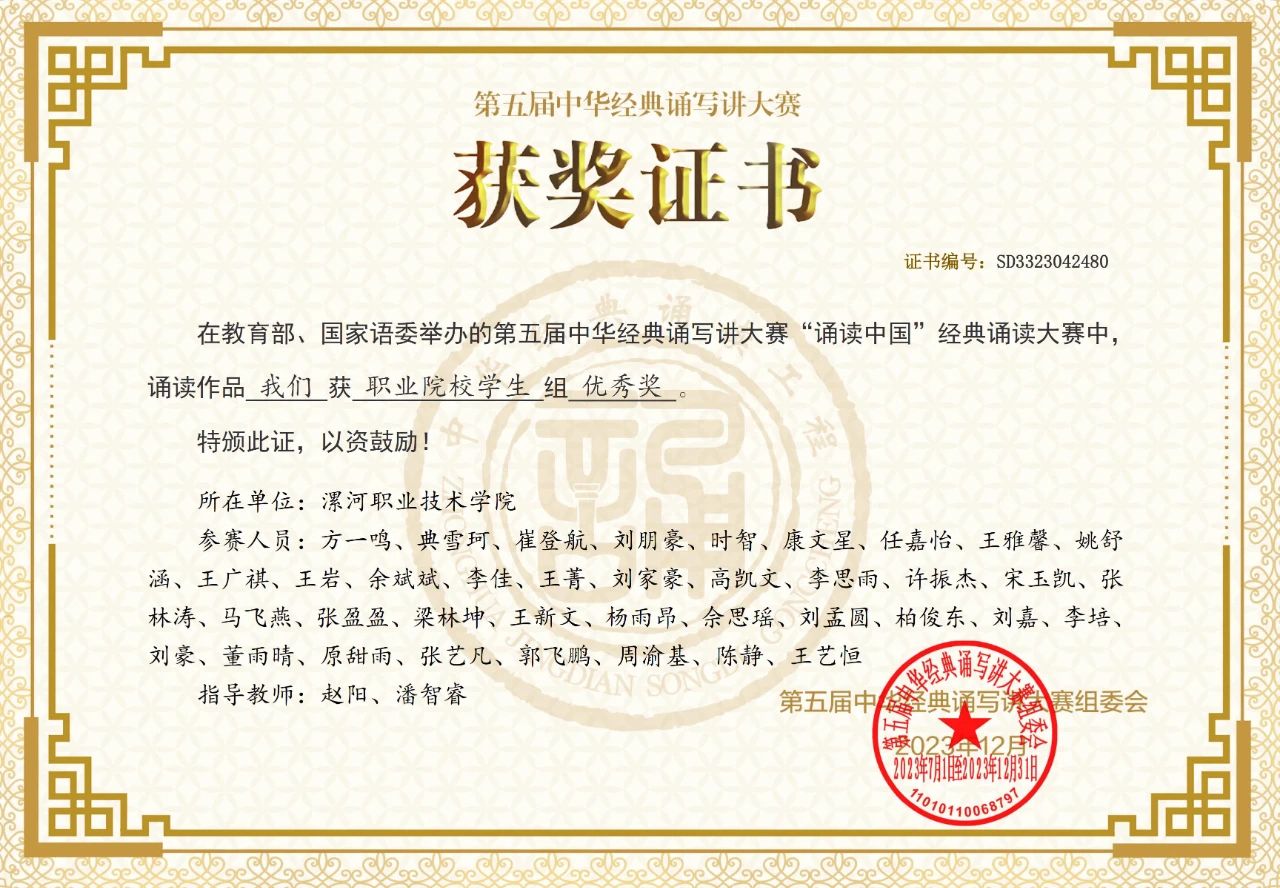 近日,全国第五届中华经典诵写讲大赛“诵读中国”经典诵读大赛获奖名单公示,由我校旅游与酒店管理系赵阳、潘智睿老师创作指导的朗诵作品《我们》荣获国家级优秀奖。