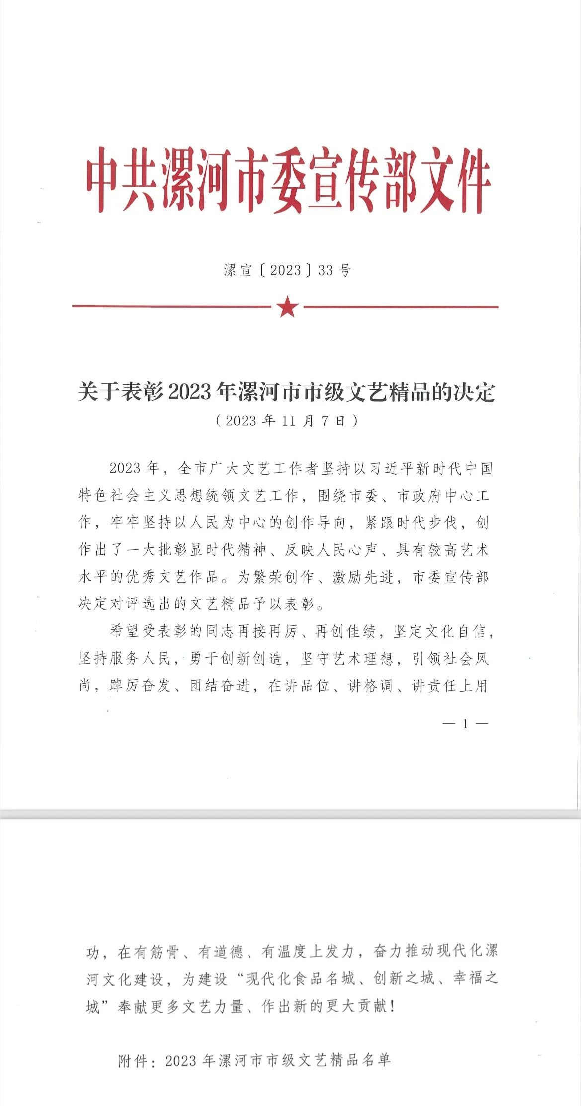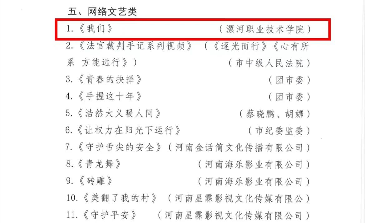近日,由中共漯河市委宣传部主办的2023年漯河文艺精品评选活动获奖名单公布,yl6809永利集团旅游与酒店管理系报送的原创作品《我们》被评为网络文艺类市级文艺精品。