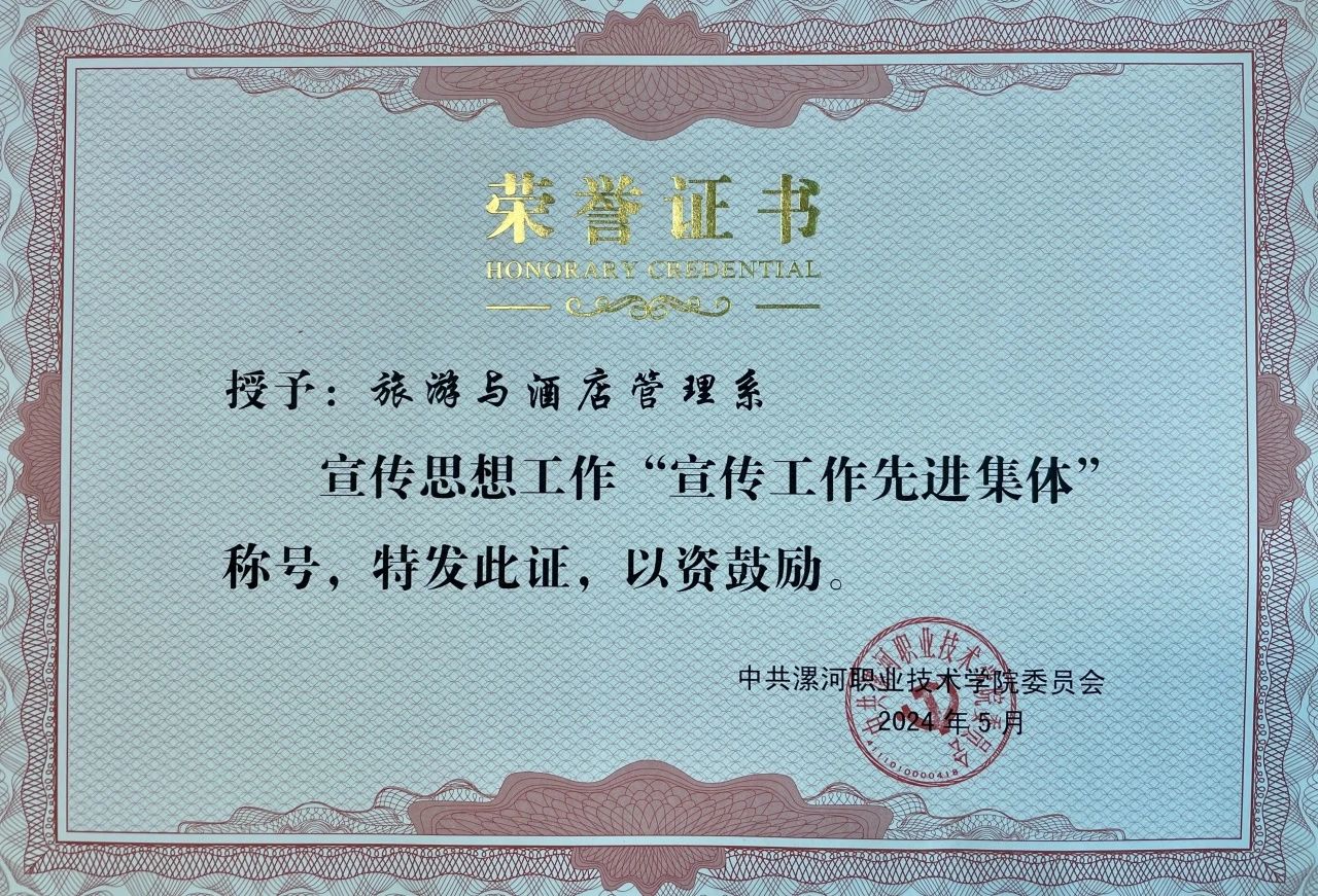近日,学院表彰了在宣传思想工作中表现突出的先进集体,激励广大师生积极参与到学院的新闻宣传工作中来。旅游与酒店管理系获评“宣传工作先进集体”称号。