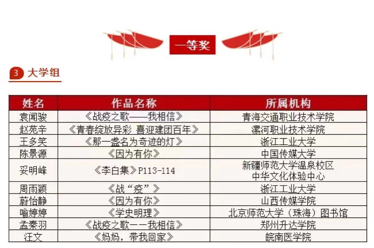 近日,由教育部语言文字应用研究所、中国国家图书馆、央视频、华东师范大学出版社、中国国际广播出版社、中国力量朗诵会、央广云听、新华社中国搜索、优谷朗读研究院等单位联合发起举办的第二季“我见证中国力量”主题朗诵比赛暨第27届世界读书日主题活动圆满落幕。旅游与航空学院21级民航二班赵苑辛原创朗诵作品《青春绽放异彩 喜迎建团百年》。经过专业评审团评审,在全国众多参赛高校中脱颖而出,荣获大学生组全国第二名并获一等奖!