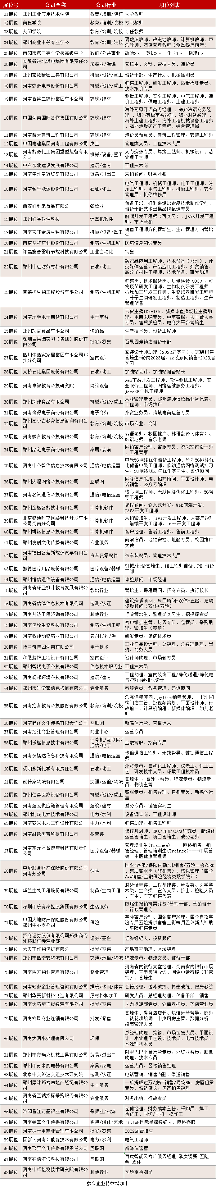 截至目前,已有郑州工业应用技术学院、中国电建集团河南工程有限公司、河南省第二建设集团有限公司、郑州顶益食品有限公司、中治东北建设发展有限公司、西安好利来食品有限公司等113余家国企、上市公司和知名企业报名参会,提供岗位4800余个。