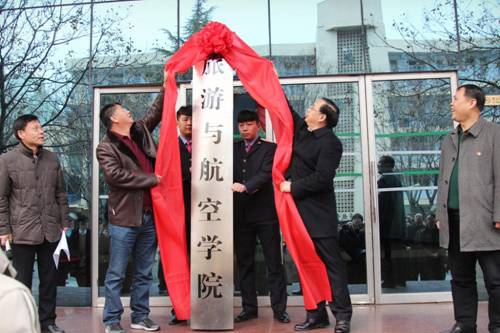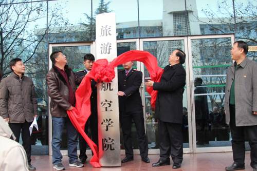 宋岩发表讲话。他希望两家强强联合,在漯河市、河南省打出一番天地,把空乘专业建生成有特色的专业。最后,宋岩和顾文明共同为“旅游与航空学院”揭牌。