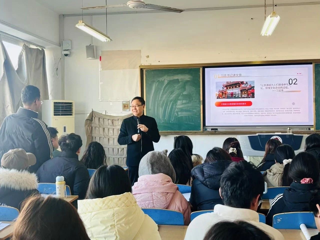 党课围绕四个方面展开。在“习总书记讲文旅”部分,朱晓红强调了习近平总书记对文化和旅游融合发展的高度重视,指出文旅融合对于推动经济发展、传承文化、满足人民美好生活需求的重要意义。谈到“古代大咖的文旅之路”,列举了李白、徐霞客、苏轼等古代名人的游历故事,生动地展现了古人在文旅方面的探索和追求,让学生们深刻感受到文旅的历史底蕴。对于“河南文旅发展新亮点”,朱晓红介绍了近年来河南省在文旅领域的创新举措和突出成就,如“只有河南·戏剧幻城”、洛阳汉服、被网友称作“5A级购物景区”的胖东来等,激发了学生们对家乡文旅事业的自豪感和责任感。最后,在“文旅专业学生的学习与成长”方面,他鼓励学生们要扎实学习专业知识,积极参与实践活动,提高自身综合素质,为未来投身文旅事业做好充分准备。