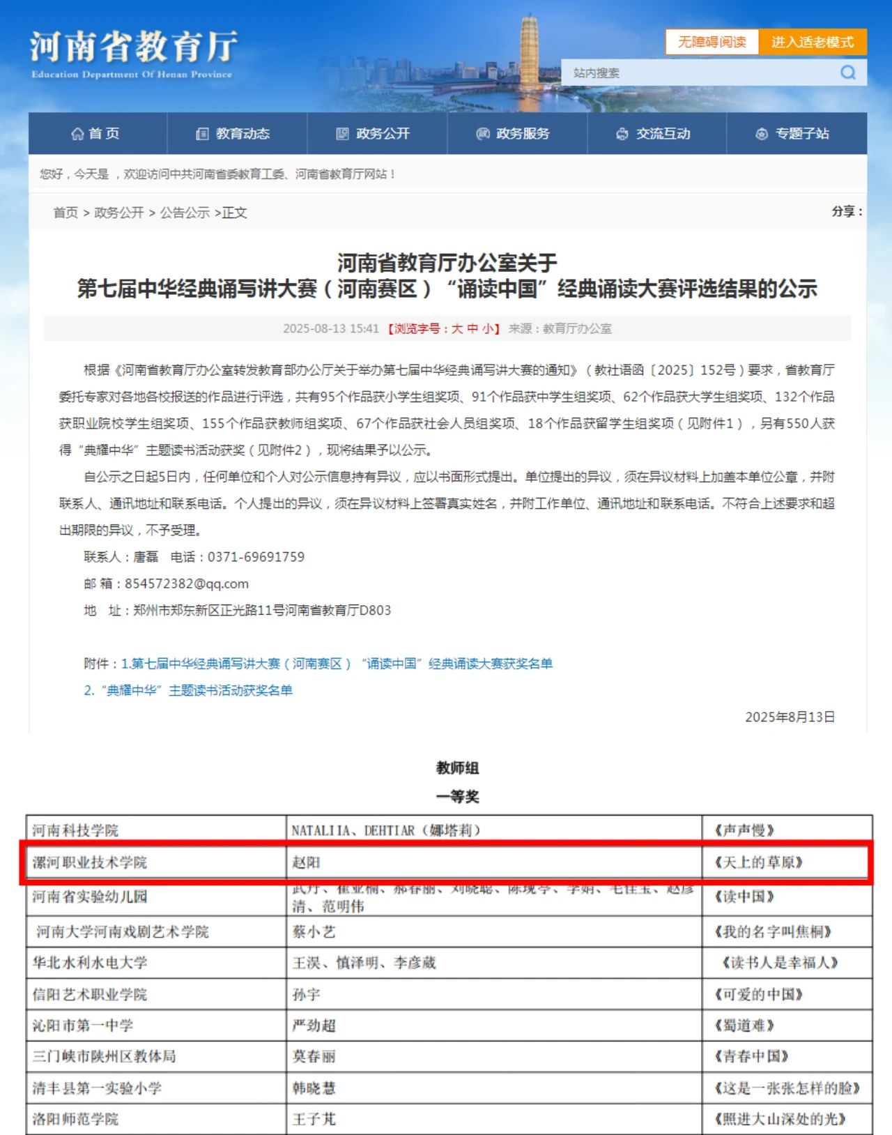 近日,第七届中华经典诵写讲大赛(河南赛区)“诵读中国”经典诵读大赛评选结果公示。yl6809永利集团赵阳老师的作品《天上的草原》荣获教师组一等奖,并代表河南省成功入围第七届中华经典诵写讲大赛国赛决赛。