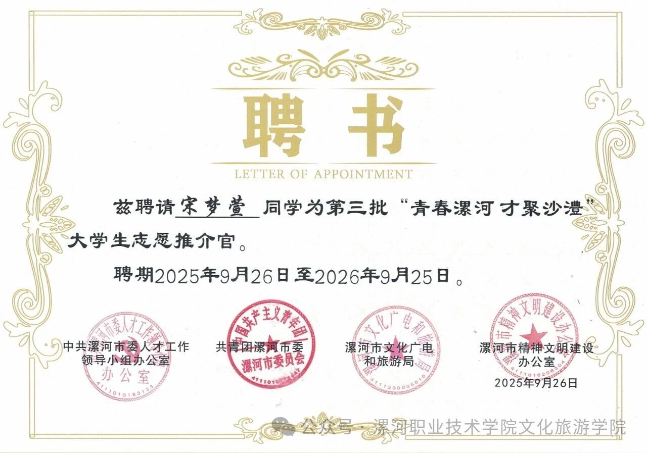 近日,从漯河市委人才办、市文明办、市文旅局、共青团市委联合举办的第三批“青春漯河 才聚沙澧”大学生志愿推介官招募活动中传来喜讯,我院郑荷玲、宋梦萱两位同学成功入选,被授予第三批“大学生志愿推介官”荣誉称号。值得一提的是,这两位同学并非漯河本地人,她们将以“新漯河人”的视角,向全国高校学子推介这座她们求学、生活的城市。