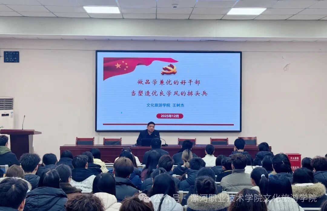 王树杰在党课中围绕学生干部的角色定位、素养提升与行动实践,系统阐述了学生骨干在学院学风建设中的关键作用。他强调,学生干部必须牢记初心使命,深刻理解“我是谁、为了谁、依靠谁”这一根本问题,务必以学业为本,争做勤学典范;牢固树立服务意识,紧密依靠广大同学开展工作;坚决摒弃不良习气,永葆服务本色。