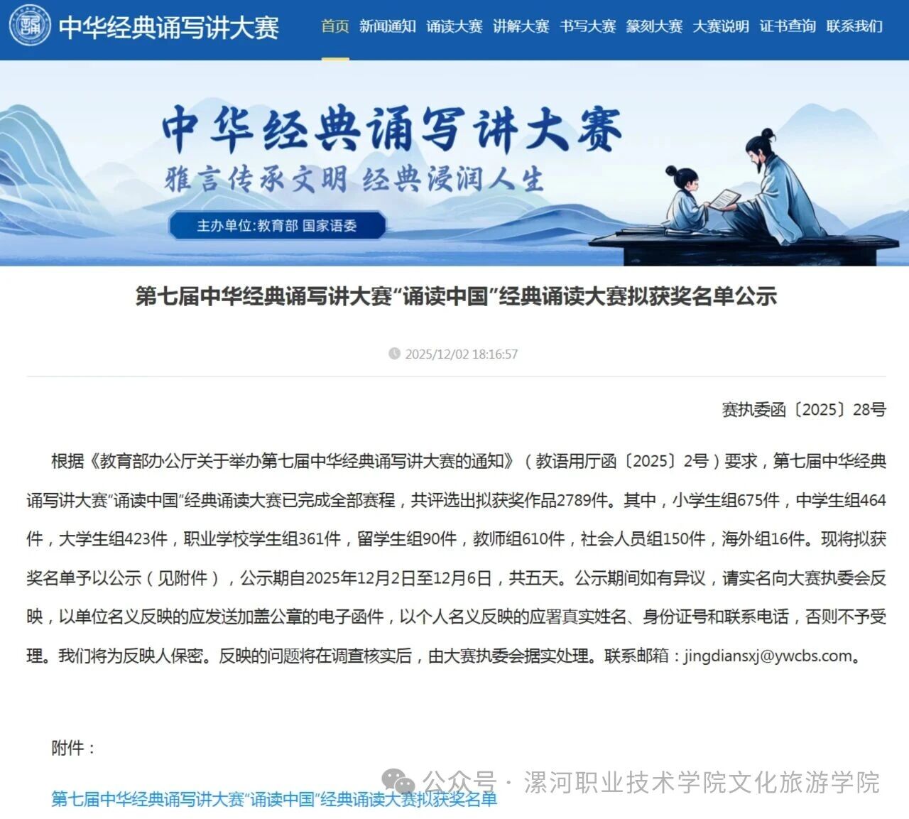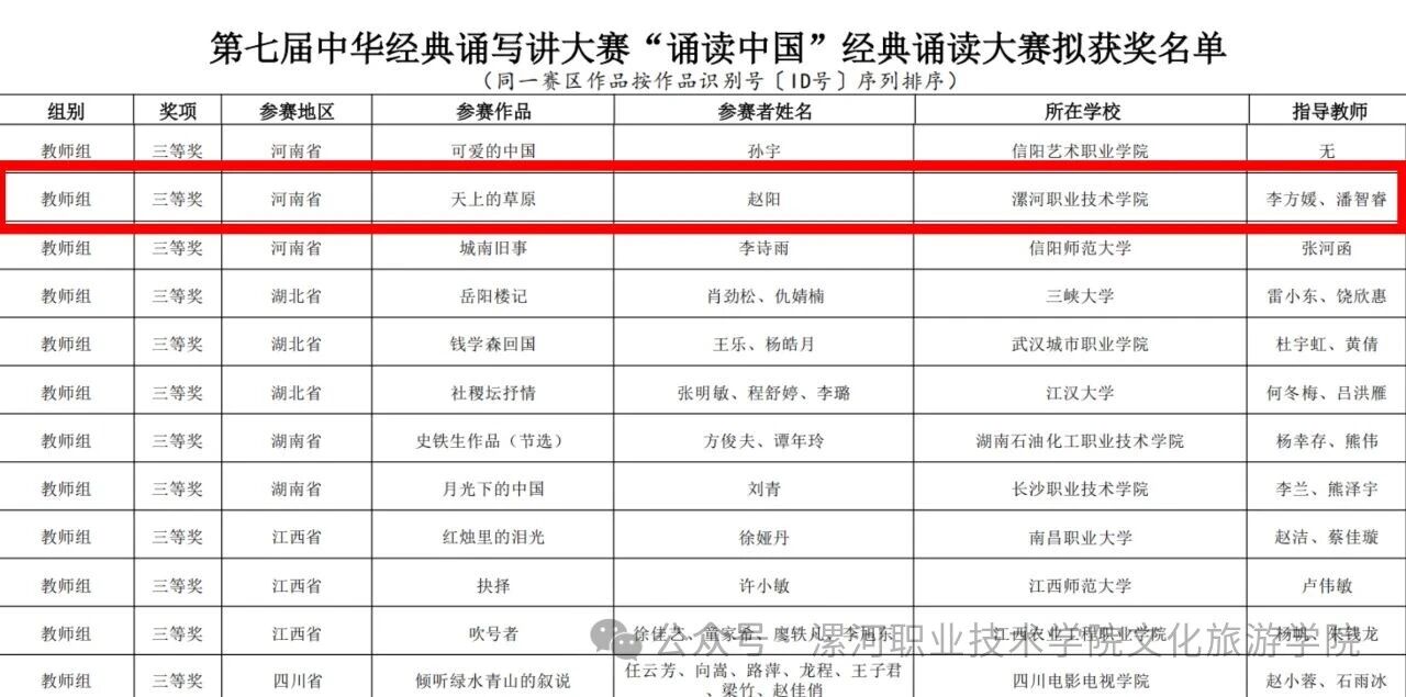 近日,第七届中华经典诵写讲大赛“诵读中国”经典诵读大赛获奖名单正式公布。我院赵阳老师凭借深厚的朗诵功底与对经典文化的透彻领悟,在全国舞台上脱颖而出,荣获教师组三等奖。