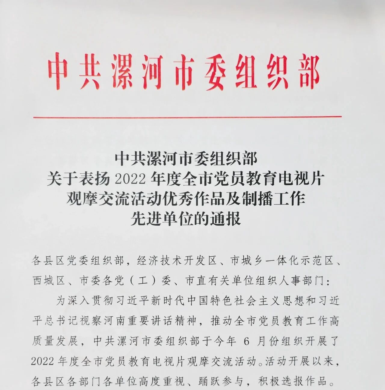 近日,中共漯河市委组织部下发《关于表扬2022年度全市党员教育电视片观摩交流活动优秀作品及制播工作先进单位的通报》,yl6809永利集团荣获全市党员教育电视片制作工作先进单位,选报作品《坚守》荣获一等奖,《信仰》荣获优秀奖,《党在我心中》荣获优秀党课。