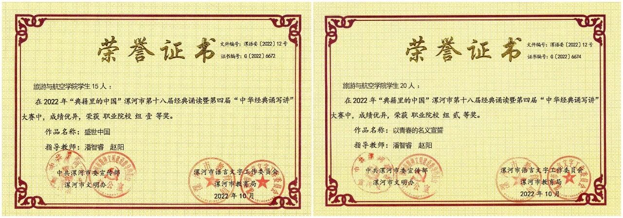 近日,由中共漯河市委宣传部、漯河市文明办、漯河市语言工作委员会、漯河市教育局举办的2022年“典籍里的中国”漯河市第十八届经典诵读暨第四届“中华经典诵写讲”大赛落下帷幕。我校旅游与航空学院选送的原创作品《盛世中国》、《以青春的名义宣誓》分别荣获职业院校组一、二等奖。