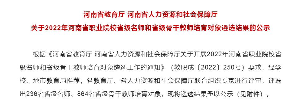 近日,河南省教育厅 河南省人力资源和社会保障厅发布了《河南省教育厅 河南省人力资源和社会保障厅关于2022年河南省职业院校省级名师和省级骨干教师培育对象遴选结果的公示》,我校赵冬梅、彭芳、荣长玲、孙冬玲4名教师入选2022年河南省职业院校省级名师培育对象,李远、赵璐、轩克辉、王爱花、陈桂华、李冠磊、陈利亚、李施、夏敬飞、陈绮、侯冰、杨志刚、贾娟13名教师入选2022年河南省职业院校省级骨干教师培育对象。