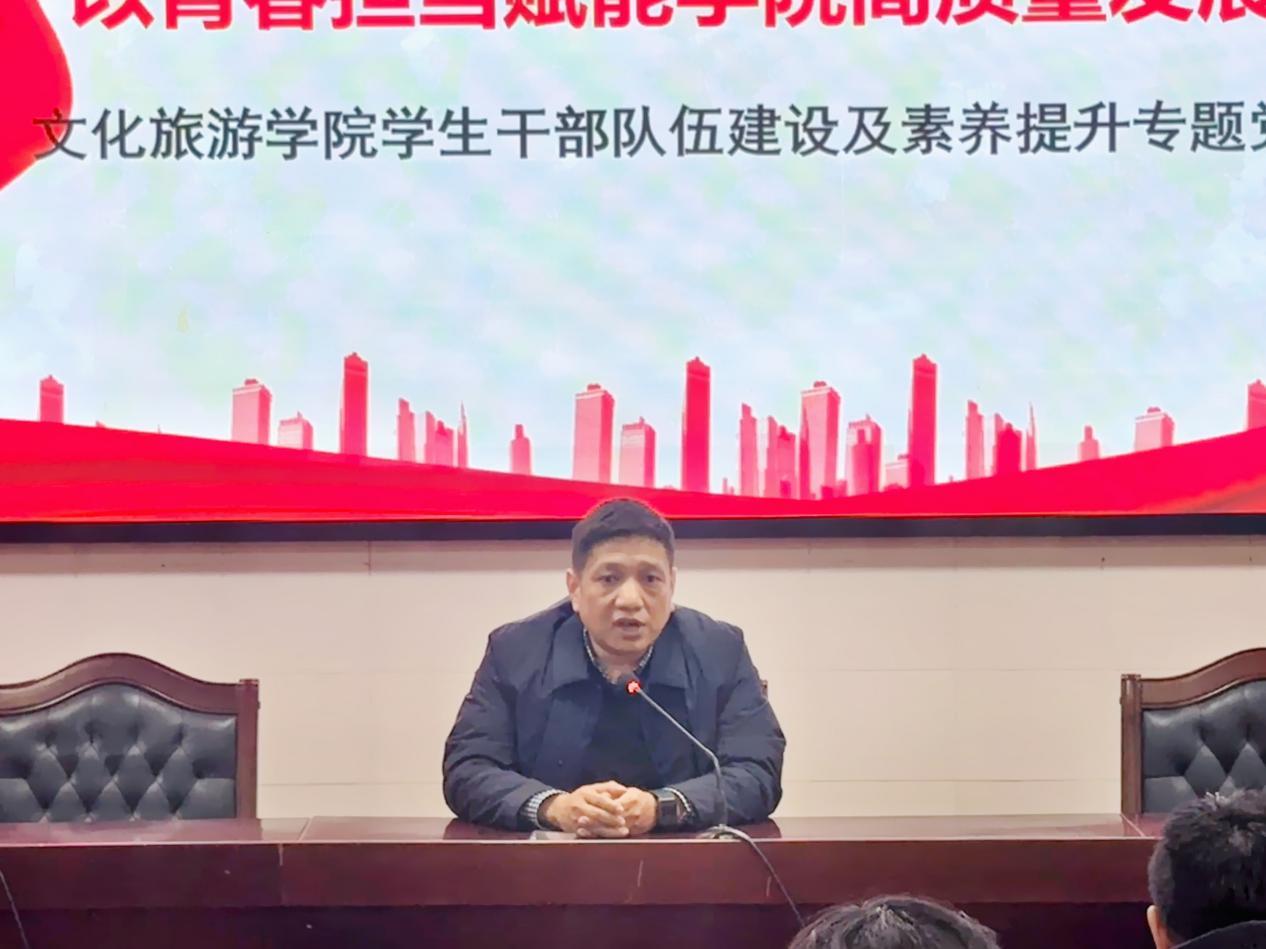 会上,王树杰书记以“当好学风排头兵练就文旅真本领以青春担当赋能学院高质量发展”为题,为全体学生干部讲授专题党课,围绕“明定位”“提素养”“见行动”三个方面展开阐述,深刻剖析了学生干部在学院发展和学风建设中的重要作用。王树杰强调,学生干部要牢记初心使命,严于律己、服务同学、主动作为,在学习、工作和生活中充分发挥表率作用,以实际行动引领优良学风,为学院高质量发展贡献青春力量。