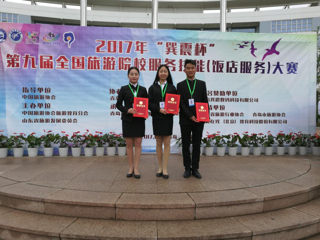 5月6日至9日,2017年“巽震杯”第九届全国旅游院校服务技能(饭店服务)大赛在青岛酒店管理职业技术学院举行。我院旅游与酒店管理系选派李晓莉、张依萌和胡贺明三名同学参赛,经过激烈角逐,最终分别获得高职组中餐宴会摆台三等奖、西餐宴会摆台三等奖和中式铺床三等奖的佳绩。全国旅游院校服务技能大赛是我国旅游教育领域规模最大、全面覆盖中高职本科院校的品牌赛事。本届大赛共有来自全国的256所本科院校、高职高专院校和中职学校的789名选手参赛,参赛院校数和参赛选手人数之多为历届饭店服务大赛之最。我院旅游与酒店管理系首次参加此项赛事,报名参加三个项目同时获奖,实属不易。